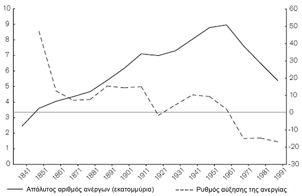 Γράφημα 1: Απασχόληση στη βιομηχανία του Ηνωμένου Βασιλείου: 1841-1991