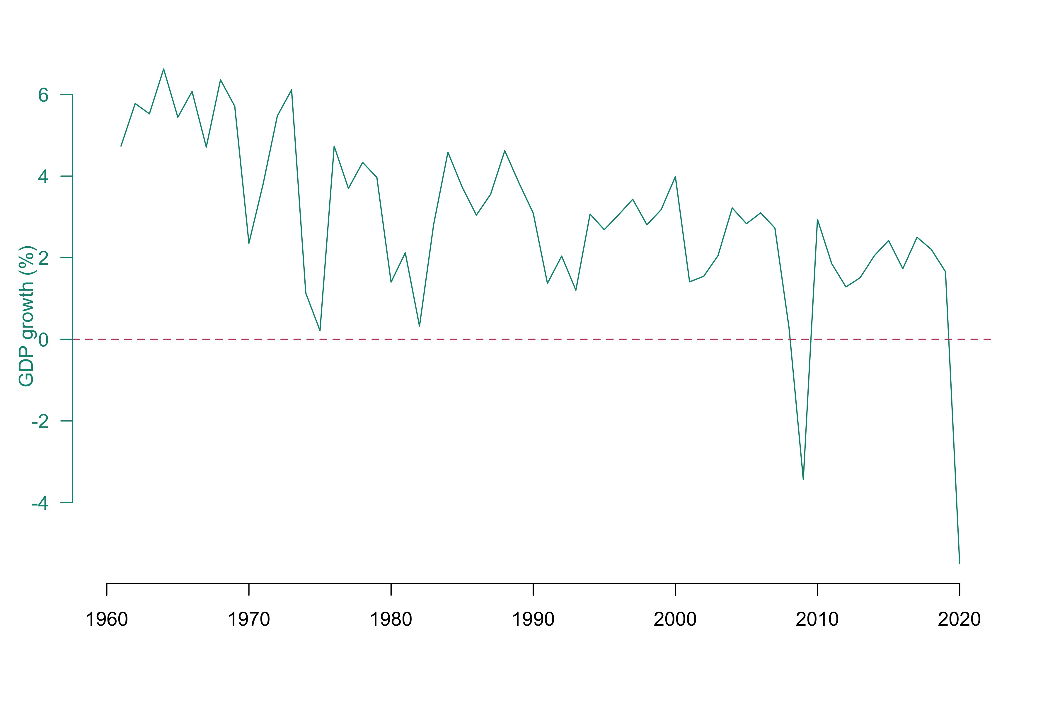 Taux de croissance économiques, pays de l’OCDE, 1960 – 2020